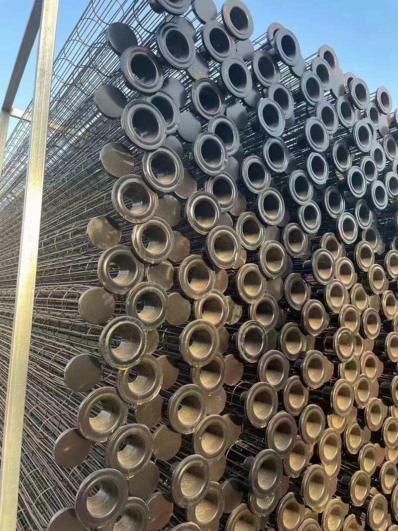 除塵布袋骨架是采用直徑為3-4個(gè)的碳鋼絲或不銹鋼絲為原材料,由縱筋和支撐環(huán)縱橫疊交焊接成的籠形件。除塵布袋骨架安裝在脈沖除塵器和氣箱式脈沖除塵器中的花板孔上,用來(lái)支撐除塵濾袋防止塌陷,有助于粉塵的清除和提供除塵效率。粉塵是附著在除塵濾袋的外表面,含塵氣體經(jīng)過(guò)除塵器時(shí),粉塵被捕集在濾袋的外表面,而干凈氣體通過(guò)濾料進(jìn)入濾袋內(nèi)部后經(jīng)風(fēng)機(jī)排出。